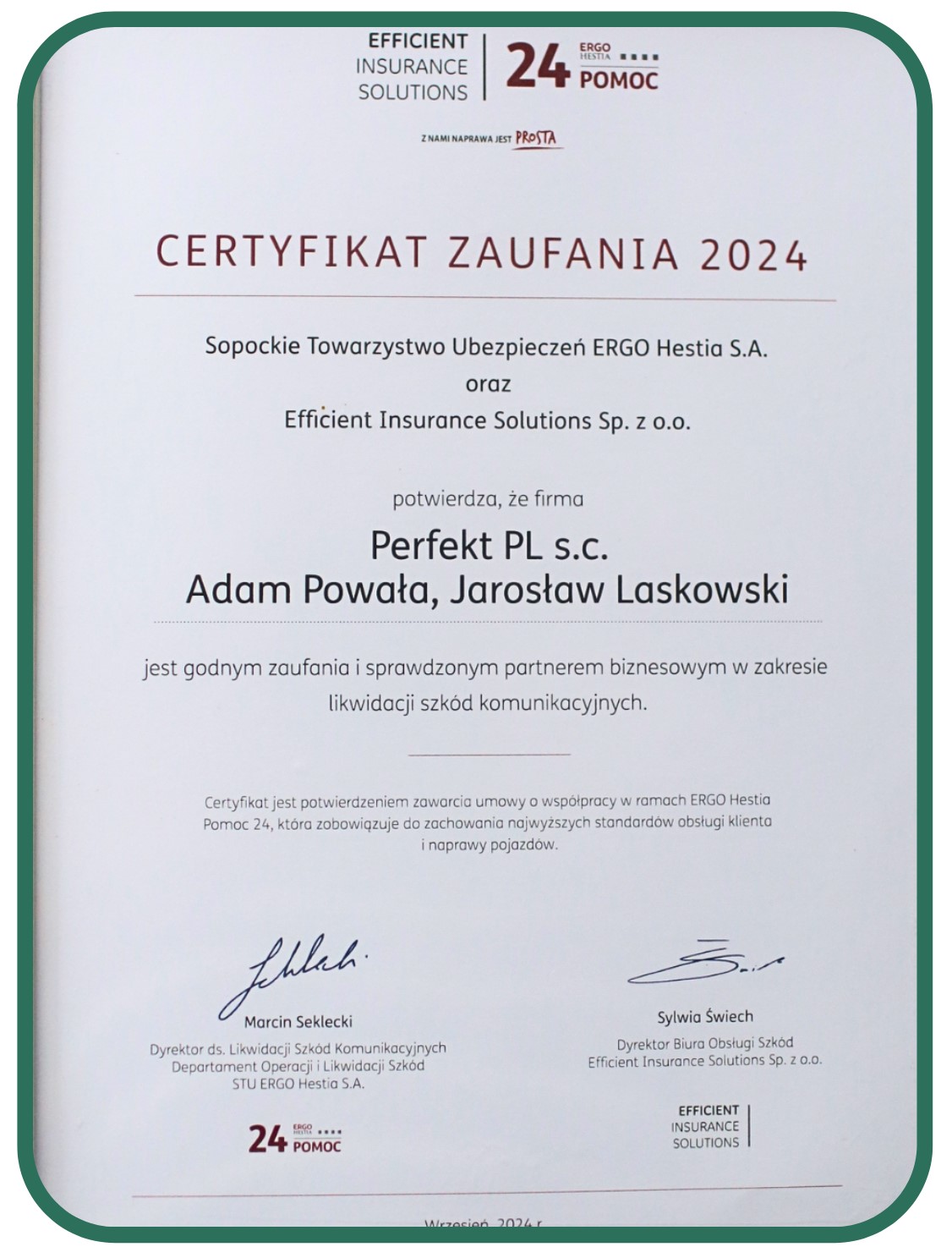 Firma Perfekt PL s.c. została wyróżniona Certyfikatem Zaufania 2024, przyznanym przez ERGO Hestię i Efficient Insurance Solutions Sp. z o.o.. To prestiżowe wyróżnienie potwierdza nie tylko najwyższy poziom świadczonych usług w zakresie likwidacji szkód komunikacyjnych, ale także zaufanie, jakim obdarzają nas najwięksi partnerzy branży ubezpieczeniowej.