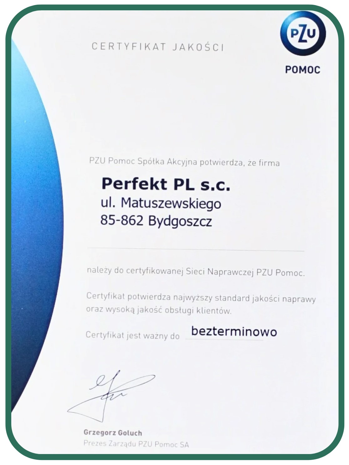 Jakość nie bierze się znikąd – wymaga lat doświadczenia, profesjonalizmu oraz zaufania klientów i partnerów biznesowych. Firma Perfekt PL s.c. z Bydgoszczy otrzymała prestiżowy Certyfikat Jakości wystawiony przez PZU Pomoc Spółka Akcyjna, który potwierdza najwyższy standard wykonywanych napraw oraz wyjątkową jakość obsługi klienta.